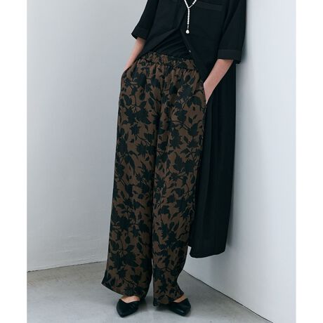 ■デザイン過去にICBで好評だったフラワープリントをきれい目ワイドパンツに落とし込んだ、新しい着映えボトムです。ウエストはゴム仕様で、ラクな履き心地なのも嬉しいポイント。華やかさと程よい光沢、シアー感が特徴で、夏に向けてシンプルになりがちなコーディネートをブラッシュアップしてくれる、存在感のある一枚です。