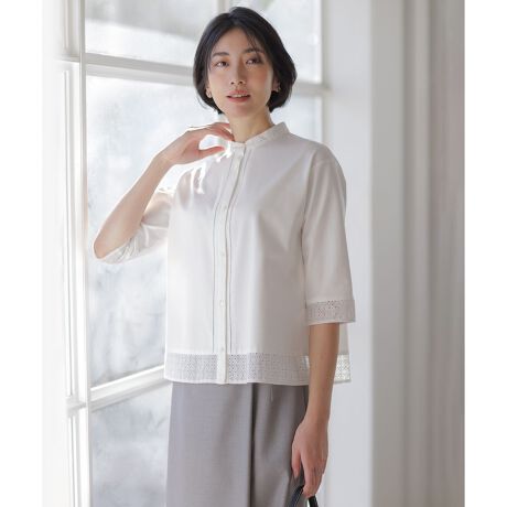■デザイン繊細な幾何柄刺繍を襟・裾・カフスにあしらい、上品なアクセントを加えたカットソー。前立て横に施されたハシゴレースが、軽やかな抜け感を演出。きちんと感のあるシルエットの中に華やかさをプラスしました。ジャケットのインナーとしてビジネスシーンにはもちろん、1枚着としてエレガントな装いにも映えるアイテムです。前あき仕様で着脱もしやすく、忙しい朝にも頼れる1着です。カラーは、清潔感のあるホワイト(#001)、上品で落ち着いたグレージュ(#003)、爽やかなアクセントになるグレイッシュブルー(#072)の3色展開です。