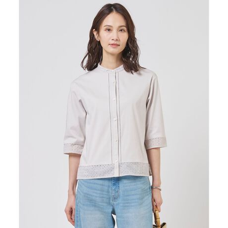 繊細な刺繍とレースがアクセントになった、上品な光沢感のあるバンドカラーカットソー