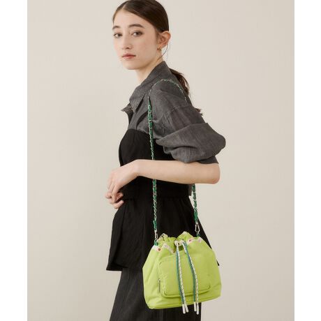 軽やかなリップストップナイロンに、シンセティックレザー(合皮)のハンドルとチェーンストラップを組み合わせました。鮮やかな2本のカラーコードがアクセントとなり、カジュアルさの中に洗練された印象をプラスしています。
