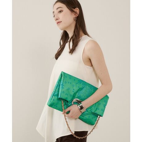 トートバッグとして手持ちで使えるほか、取り外し可能なチェーンストラップで肩掛けやクロスボディでも使用可能。荷物が少ないときは2つ折りにしてクラッチバッグとしてもお使いいただけます。手持ちスタイルではA4サイズの書類が収まるサイズ感で、デイリーに活躍。