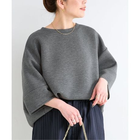 着心地:肘が隠れる袖丈ですが素材感軽く、肌離れしたフォルムなので涼しく着られます。ゆとりがあるので寒い時期には重ね着しやすいシルエットで、切り替えによって立体感のあるシルエットが魅力です。