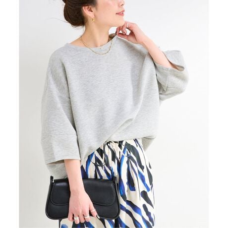 着心地:肘が隠れる袖丈ですが素材感軽く、肌離れしたフォルムなので涼しく着られます。ゆとりがあるので寒い時期には重ね着しやすいシルエットで、切り替えによって立体感のあるシルエットが魅力です。