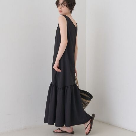 すっきりとしたノースリーブの上身で、裾に向けて広がるマーメイド調のフリルを配したフェミニンなシルエット。無駄のないラインを基調に、素材のテクスチャーが際立つミニマルなデザインです。背面のファスナーで着脱もスムーズ。