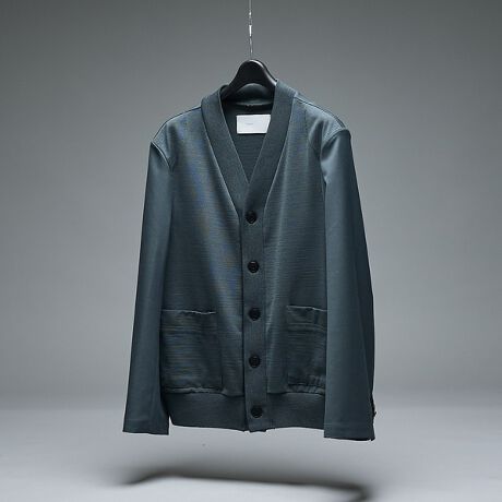 ジャージ素材をメインに構成し、袖の部分をスーツスリーブをドッキングしたカーディガン。ドッキングされた袖は、4つの重ねボタンの本切で丁寧に仕上げられています。更に共地で作成された肩パットも取り入れた組み合わせによって、とても面白いバランスに仕上がった1着。