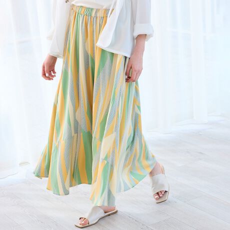 シャープな印象のジオメトリック柄をプリントしたタフタスカートにチュールを重ねることで、奥行きのある表情と軽やかな動きを演出するスカートです。