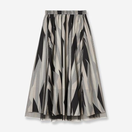 シャープな印象のジオメトリック柄をプリントしたタフタスカートにチュールを重ねることで、奥行きのある表情と軽やかな動きを演出するスカートです。