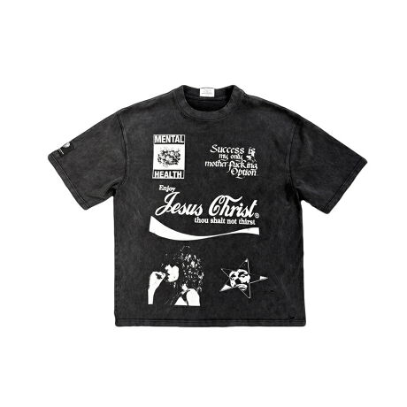 かすれ感のある加工ボディに、コラージュ調のロゴやメッセージプリントを組み合わせ、ストリート×ロックテイストを表現した存在感のある一枚です。
