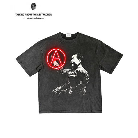 ヴィンテージライクなフェード加工ボディに、毛沢東モチーフのフォトプリントとネオン調“A”グラフィックを重ねた、アート性とストリート感を融合したデザインが特徴です。