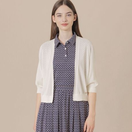 MACKINTOSH LONDONの定番モデル『BrayBolero/ブレイボレロ』です。ドルマン風のゆったりしたアームホールに肘が隠れる上品な袖バランスがポイントで、ワンピースの上にさらっと羽織れる便利なアイテムです。シームレスで快適な着心地を実感していただけます。同素材のワンピース(品番:G5J12709)とアンサンブルで着用していただけます。