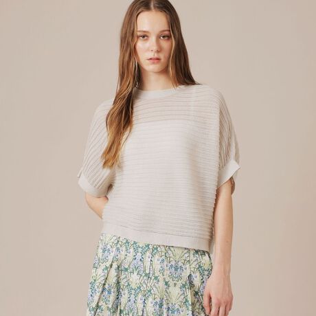 [型番:G5N13711__]【ウォッシャブル】【着用推奨シーズン:春・夏】<素材説明>コットンにポリエステルを合わせ、ハリを持たせた素材です。極細番手の糸を使用し、編地にシアー感が生まれドライで清涼感のある風合いが特徴です。<デザインポイント>上品なシアー感のあるニットプルオーバーです。繊細な透け感を活かして、さまざまなインナーとの着こなしをお楽しみいただけます。見た目の軽さに加え、肌離れの良い素材で涼しくご着用いただけます。