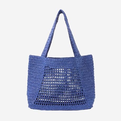 [型番:G5111746__]透かし編みが涼しげなの手編みのトート型かごバッグです。ポリプロピレンの紐を使っているので色鮮やかで丈夫なバッグとなっています。底は折り畳み式で、広げると荷物が安定しやすく、畳めばフラットになるので収納に便利です。容量も大きく、タウンやリゾートで大活躍するバッグです。