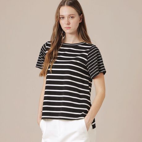 袖は細い巾で繊細に、身頃は存在感のある巾で印象強く、2種類の表情の違うボーダーを組み合わせたトップスです。日本の生地を日本の縫製工場で丁寧に仕上げています。様々なシルエットのボトムスとも相性が良く、エレガントながらリラックス感のあるスタイリングに最適です。