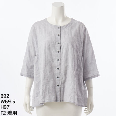 シャーリング加工による程よい伸縮性と凹凸感が、肌への密着を抑えてさらりとした着心地をキープ。身体のラインを拾わず、ふんわりと丸みのある女性らしいシルエットを自然に作り出します。