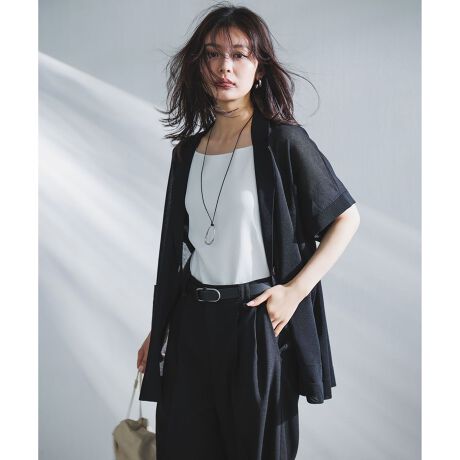 ■デザイン羽織るだけでこなれ感と鮮度をプラスしてくれる、ニット素材のジャケットジレ。ミドルレングスのゆったりしたサイズ感で、二の腕や腰まわりをカバーしてくれます。上品な肌見せのシアー素材で、春夏中心にロングシーズン活躍するアイテムです。