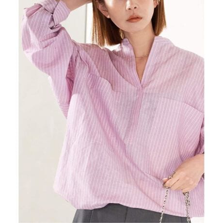 首元はすっきりとしたスキッパーデザインで、比翼ボタンで開き具合も調整できます。