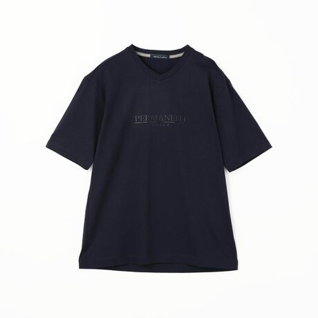 胸にワンポイントロゴを配したシンプルなVネックTシャツです。絹の様な滑り感と光沢感のある素材感と生地と同色のジェルプリントが大人な雰囲気のTシャツへとなっています