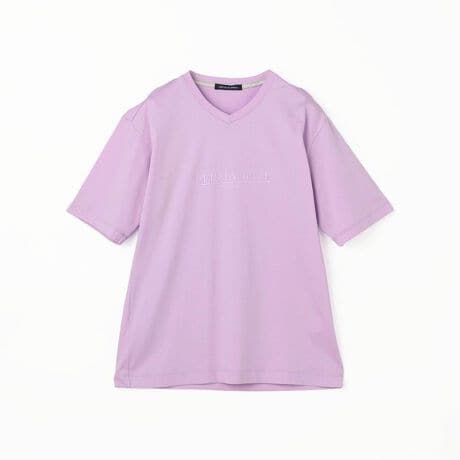 胸にワンポイントロゴを配したシンプルなVネックTシャツです。絹の様な滑り感と光沢感のある素材感と生地と同色のジェルプリントが大人な雰囲気のTシャツへとなっています