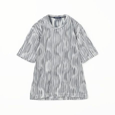 異なるポリエステル糸で編立て染色でランダムなウェーブ柄をストライプ調に表現した独特なジャカード素材を採用。