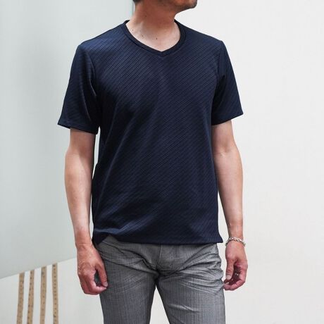 2種類のポリエステル糸で凹凸感を表現したジャカード素材。合繊の為、ハリ感があり。速乾性と防シワ性にも優れています。