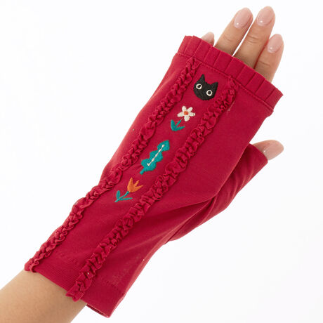 [型番:AM61645-2]接触冷感で綿100%の肌触りの良い生地を使用しております。コードフリルとMEMEの刺繍が可愛い紫外線対策手袋。フィンガーレスなので、付けたままタッチパネルの操作が出来ます。