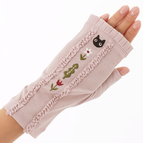 [型番:AM61645-2]接触冷感で綿100%の肌触りの良い生地を使用しております。コードフリルとMEMEの刺繍が可愛い紫外線対策手袋。フィンガーレスなので、付けたままタッチパネルの操作が出来ます。