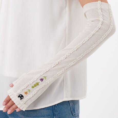 [型番:AN61658-1]接触冷感で綿100%の肌触りの良い生地を使用しております。コードフリルとMEMEの刺繍が可愛い紫外線対策手袋。フィンガーレスなので、付けたままタッチパネルの操作が出来ます。全長:約45cm