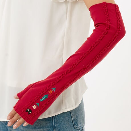 接触冷感で綿100%の肌触りの良い生地を使用しております。コードフリルとMEMEの刺繍が可愛い紫外線対策手袋。フィンガーレスなので、付けたままタッチパネルの操作が出来ます。全長:約45cm