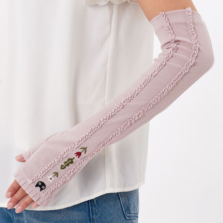 [型番:AN61658-1]接触冷感で綿100%の肌触りの良い生地を使用しております。コードフリルとMEMEの刺繍が可愛い紫外線対策手袋。フィンガーレスなので、付けたままタッチパネルの操作が出来ます。全長:約45cm