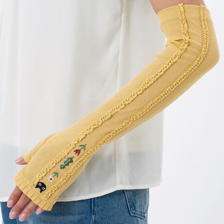 [型番:AN61658-1]接触冷感で綿100%の肌触りの良い生地を使用しております。コードフリルとMEMEの刺繍が可愛い紫外線対策手袋。フィンガーレスなので、付けたままタッチパネルの操作が出来ます。全長:約45cm