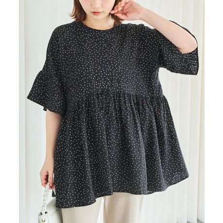 袖のフリルデザインでさりげない華やかさをプラスしました。切替から広がるフレアシルエットで体型カバーも◎