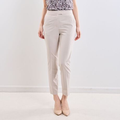 初夏におすすめなセットアップスーツのパンツ。定番の9分丈テーパードシルエットがすっきりとした足元を演出します。さらっとしたストレッチ性のある生地を使用しているため、湿度が高く汗をかきやすい夏にもストレスフリーな着心地を実現します。ジャケットと合わせるのはもちろん、オーバーサイズのシャツと合わせたスタイリングもおすすめです。