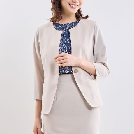 初夏に取り入れたいセットアップスーツのジャケット。ノーカラーがすっきりとした印象を与え、より女性らしさを強調しています。ステッチを入れてデザインにアクセントをプラス。さらっとした伸縮性の高い生地を使用し、汗をかきやすい夏にもストレスフリーで着用できます。ハイネックのブラウスと組み合わせた着こなしがおすすめです。