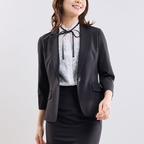 初夏にぴったりなセットアップスーツのジャケット。タイトシルエットが特徴的で、7分袖のデザインが抜け感のある印象を与えます。着丈も少し短めに仕上げており、スッキリ見えするのもポイント。さらっとした伸縮性の高い生地を使用し、湿度が高く汗をかきやすい夏にもおすすめです。