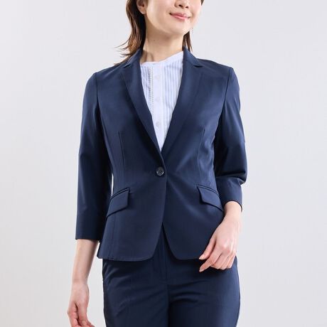 初夏にぴったりなセットアップスーツのジャケット。タイトシルエットが特徴的で、7分袖のデザインが抜け感のある印象を与えます。着丈も少し短めに仕上げており、スッキリ見えするのもポイント。さらっとした伸縮性の高い生地を使用し、湿度が高く汗をかきやすい夏にもおすすめです。