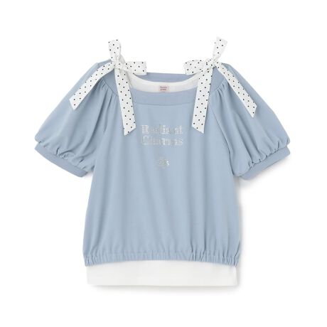 リボンつきのタンクトップとラインストーンを並べたTシャツのセットです。肩のリボンは装いに合わせてボタンで簡単に外せます。Tシャツは首元がゆったりと開いており、1枚で大人っぽく着こなすのもおすすめ。吸水速乾機能がタンクトップに、接触冷感機能がどちらにもついています。