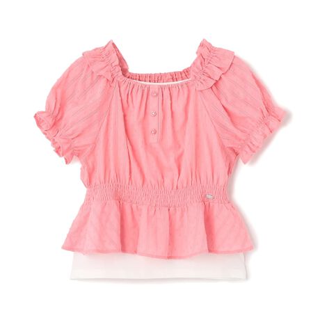 ウエストが締まっているシャーリングブラウスとシンプルなキャミソールのセットです。首元のフリルとお花のフロントボタンがかわいいポイント。ペプラムデザインなので、すっきりとしたシルエットのボトムス合わせがおすすめです。キャミソールには吸水・速乾加工がほどこされています。