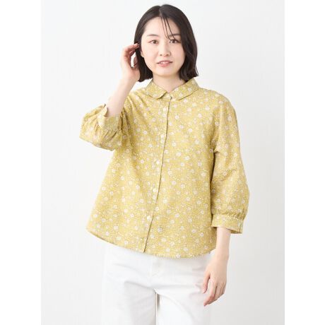 表面感のあるリップル素材に上品な小花柄をちりばめたブラウスです。袖口にギャザーを寄せてボリュームを持たせた7分丈袖に、可愛らしい小さな衿がフェミニンな印象のブラウスです。綿100%の素材は春から夏にかけて心地よく着用いただけます。初夏に似合うイエロー、ブルーと上品なネイビーの3色展開です。