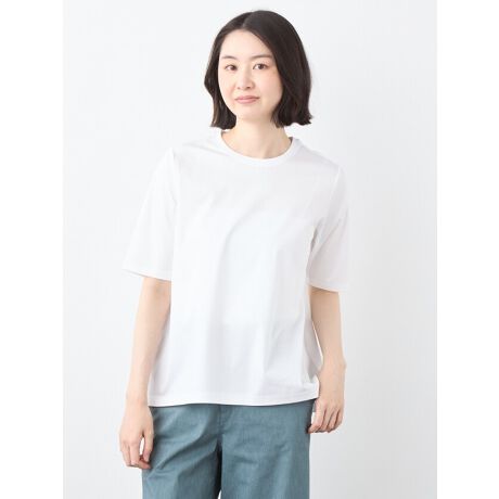 [型番:6251720]程よい光沢と滑らかな肌触りで上質感のあるベーシックTシャツです。毎年定番の目の詰まったスムース素材にシルケット加工を施してよりきれいな表面感に仕上げています。今年はひんやり感じる接触冷感機能に加えてUV CUT機能を追加しました。1枚で着用して様になる様シルエットにも拘り、裾に向かってほんのり広がるAラインにリファインしました。初夏を彩るコーディネートに1枚あると便利なアイテムです。