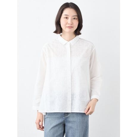 [型番:6251222]パッチワーク風のフラワー&幾何学模様の刺繍が魅力のフェミニンなブラウスです。エレメント定番のAラインシルエットのシャツ衿デザイン、1枚で着ても羽織としても様になるアイテムです。初夏に似合うオフ白とフレッシュなセージカラーを用意しました。デニムパンツに合わせたスタイルがお勧めです。