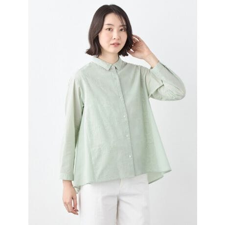 [型番:6251222]パッチワーク風のフラワー&幾何学模様の刺繍が魅力のフェミニンなブラウスです。エレメント定番のAラインシルエットのシャツ衿デザイン、1枚で着ても羽織としても様になるアイテムです。初夏に似合うオフ白とフレッシュなセージカラーを用意しました。デニムパンツに合わせたスタイルがお勧めです。