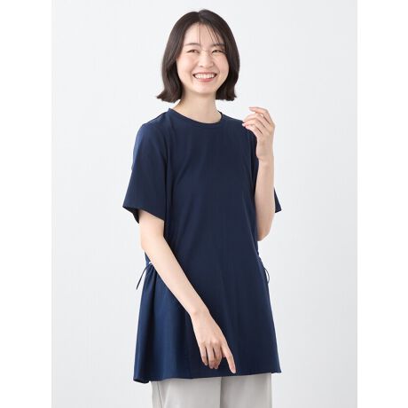 [型番:6251732]本体にストレッチ性のあるジャージィ素材、脇の切り替えにデニムライク素材をドッキングさせた長めの75着丈チュニックプルオーバーです。気になる腰回りをしっかりカバーしてくれる1枚です。ウエストは脇のパーツでギャザーを調整出来るのでデザインのアクセントも楽しめる1枚です。