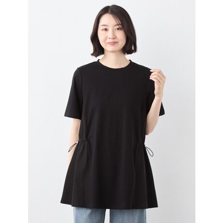 [型番:6251732]本体にストレッチ性のあるジャージィ素材、脇の切り替えにデニムライク素材をドッキングさせた長めの75着丈チュニックプルオーバーです。気になる腰回りをしっかりカバーしてくれる1枚です。ウエストは脇のパーツでギャザーを調整出来るのでデザインのアクセントも楽しめる1枚です。