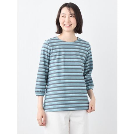 [型番:6251724]凹凸感のあるワッフル素材に多色のボーダーを編み上げたカットソープルオーバーです。さらりとした柔らかな綿素材で肌触りも良く、シーズンレスで活躍する生地感です。ワッフル地に多色のボーダーをのせることで、単調にならず、どこかニュアンスのある一枚に仕上げました。程よくゆとりがあるAラインシルエットで着心地が良く、バランスの取りやすい丈感が様々なボトムスに対して汎用性が高い一品です