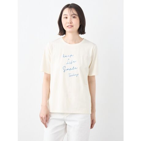 [型番:6251723]「Keep Life Simple today 」"今日もシンプルに"というメッセージを込めたグラフィックTシャツです。きれい目ながらカジュアルさも兼ね備えたプレーティング天竺を使用しています。ロゴには顔料プリントの上に所々刺繍を施し凹凸感を出して味わいのある雰囲気に。文字通りシンプルにデニムと合わせて大人のきれい目ジーニングスタイルを楽しんでください。