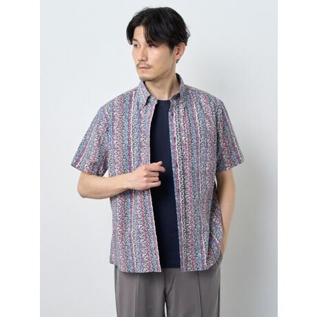 [型番:7251243]【 軽い着心地・幸福感の花柄シャツ 】フラワープリントのリップル生地を使用した半袖シャツ。ストライプ状に配色された気分の上がる花柄と、リップル加工のシボ感が魅力。汗ばんでも肌離れが良く、夏の羽織アイテムにもおすすめ。整然と並んだ花柄は個性的でありながら引き締まった印象もあり、着用しやすい1着。