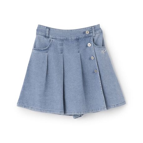 ボタンを並べたラップデザインが可愛いデニムキュロットです。