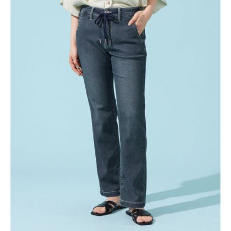 腰回りは程よくフィットし、膝下から裾にかけては直線的なラインを描くストレートシルエット。気になる太ももやふくらはぎのラインを拾わず、脚をまっすぐ細く見せてくれます。ウエストは紐付きのイージー仕様で、好みのフィット感や穿き位置に自由自在に調整可能です。