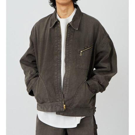 無骨なワークウェアのディテールを継承しつつも、ジップアップ仕様にすることで着脱のしやすさと現代的な表情を両立。