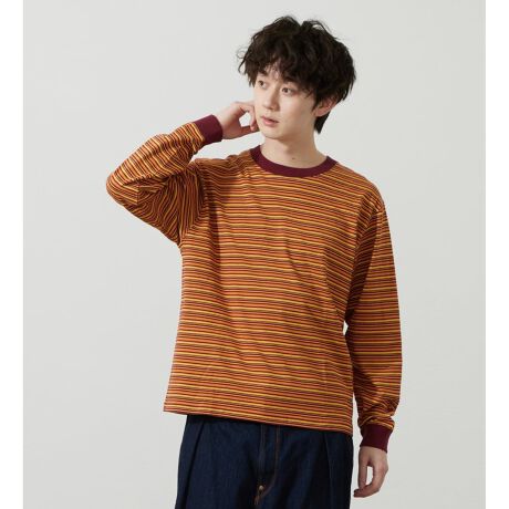 Leeオリジナルの絶妙な配色が目を惹くボーダー長袖Tシャツです。パープル、オレンジ、チャコールグレーといった深みのあるカラーバリエーションは、カジュアルながらもどこか落ち着いた大人な印象を与えます。シルエットは着る人を選ばないレギュラーフィットを採用。